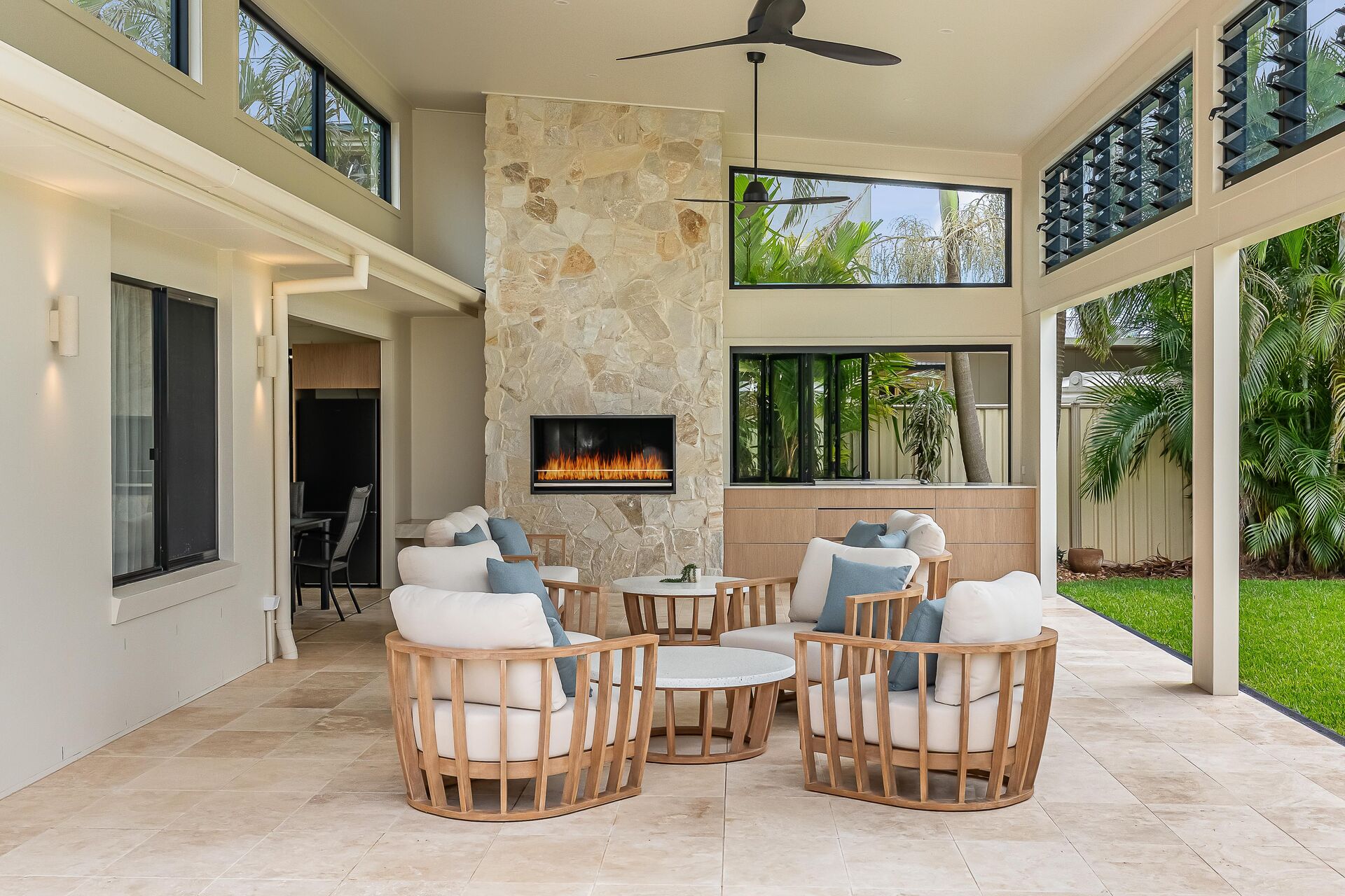 A stunning fireplace finished in Sabi natural stone cladding creates a striking focal point while enhancing the sense of warmth and comfort. Underfoot, linen travertine flooring adds softness and texture, reinforcing the calming design direction.