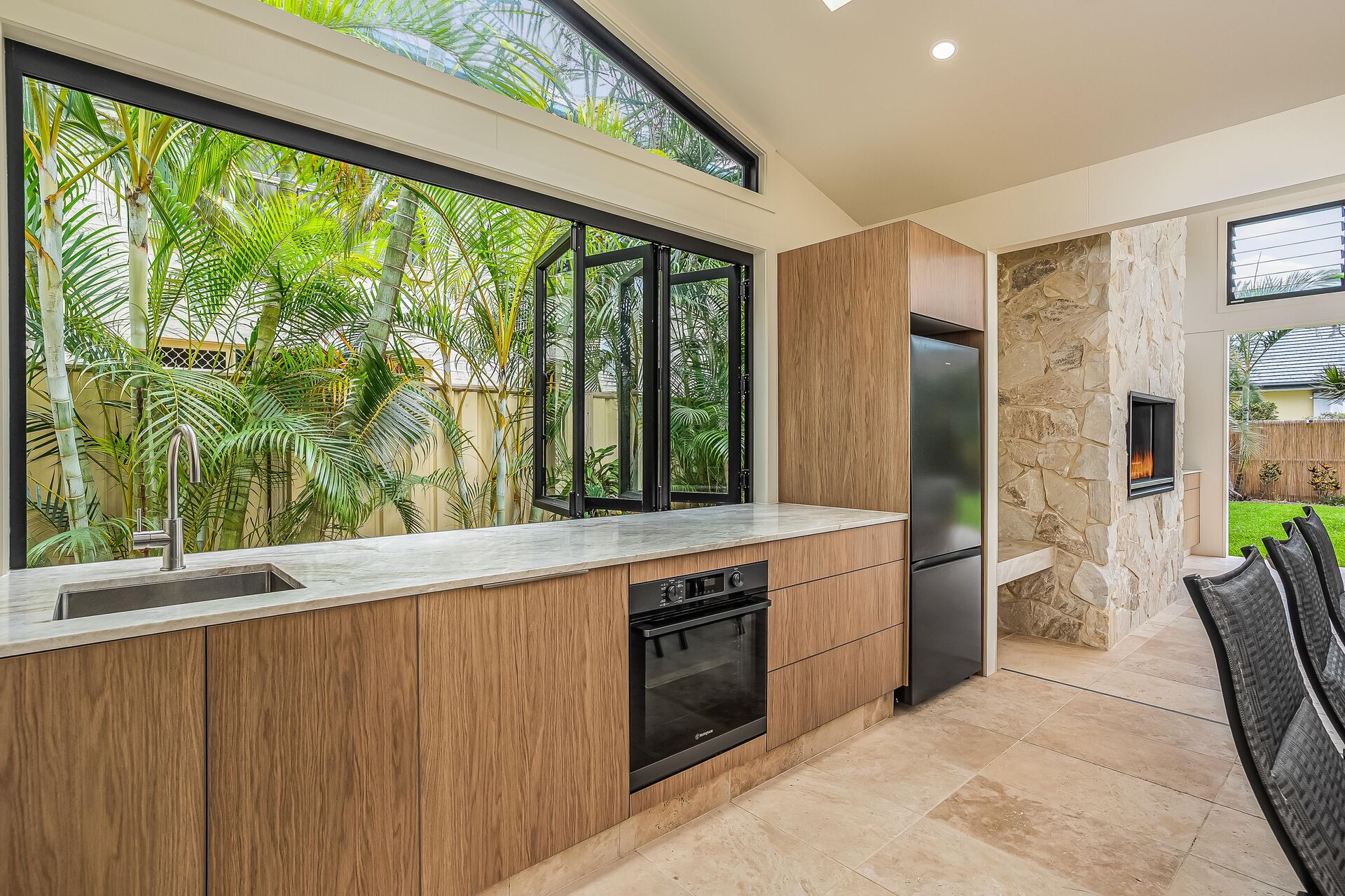 Natural light was a key focus of the design. We incorporated louvred windows, bifold windows, skylights and fixed glass panels to flood the space with light while maintaining comfort. To minimise heat and glare without compromising clarity, we specified Clear Synergy glass — ensuring the area remains bright yet comfortable throughout the day.