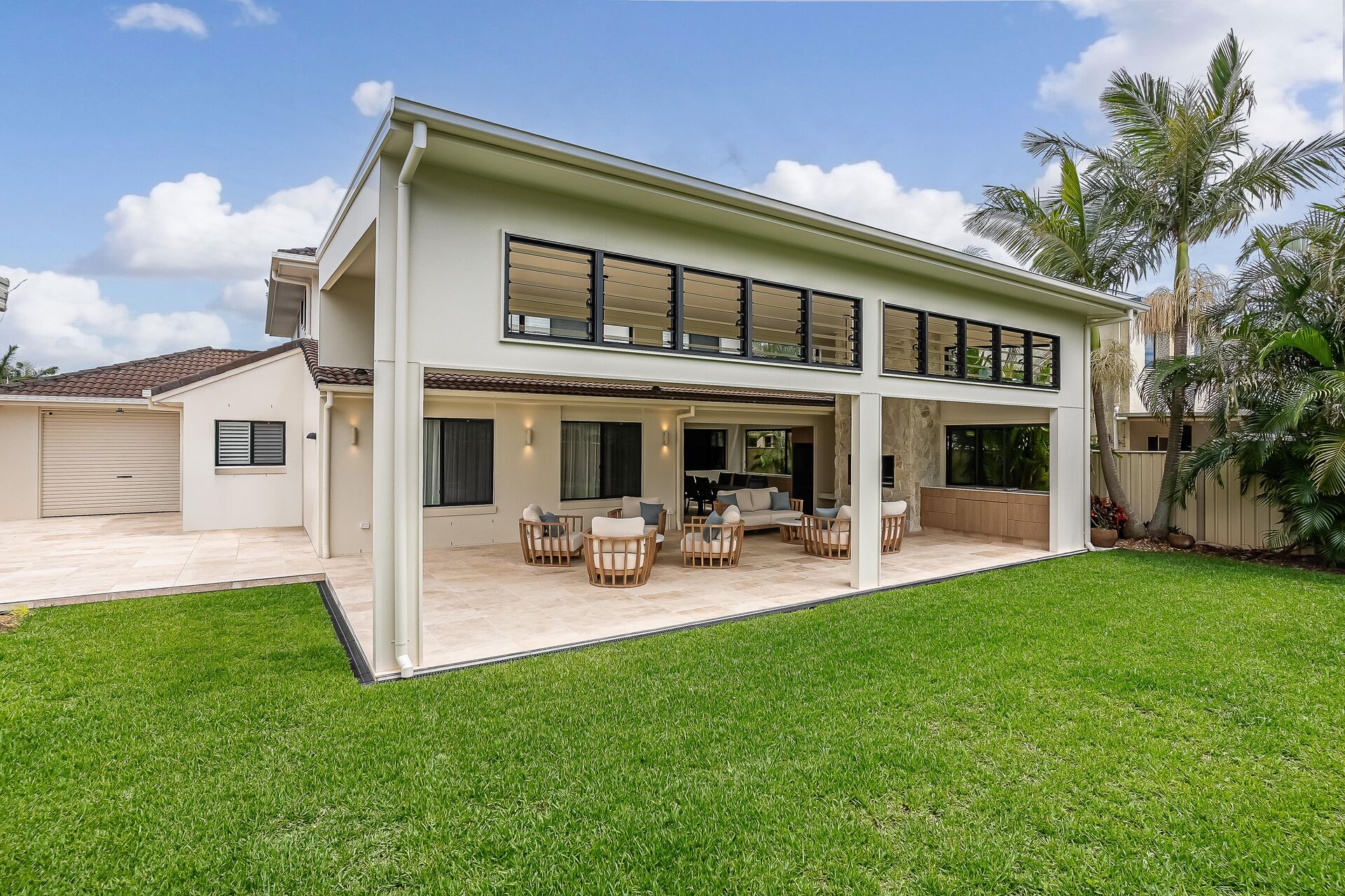 To complete the transformation, we repainted the entire exterior of the home and installed new outdoor lighting, elevating the overall ambience and ensuring the space transitions seamlessly from day to evening entertaining.