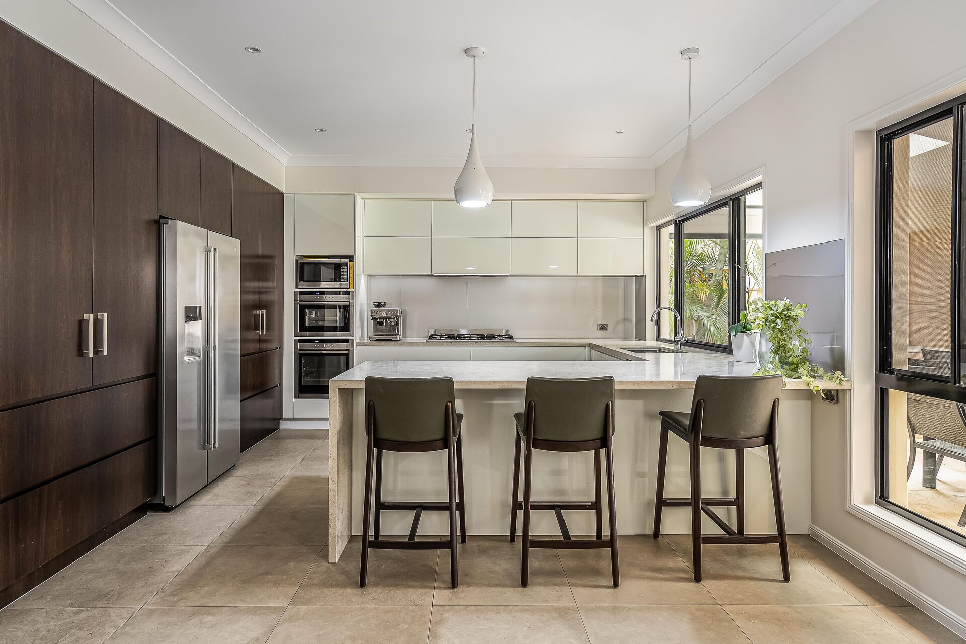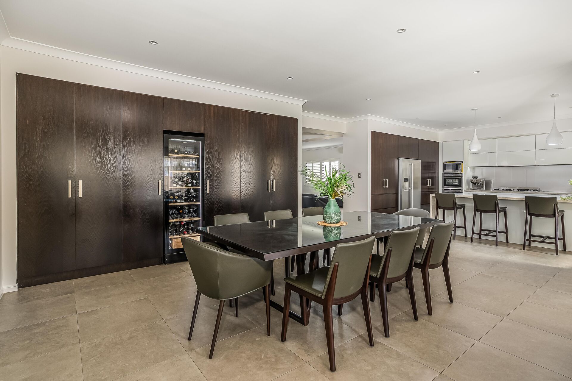 The front entry was modernised with new timber doors, a new set of beautiful timber stairs were installed and finished with frameless glass balustrade to continue the contemporary theme to the upper floor. Another important element of the renovation was to create additional storage under the stairs ensuring a cohesive look between the kitchen and living areas so it further enhanced the look of the rooms. We reconfigured the space under the stairs and connected the two rooms using the same material used on the doors in the kitchen, we achieved something not only functional but a truly luxe in design, look and feel.